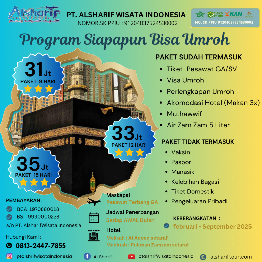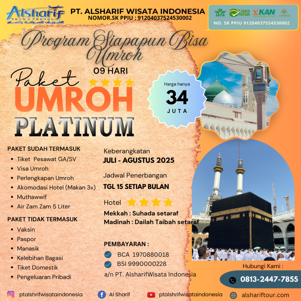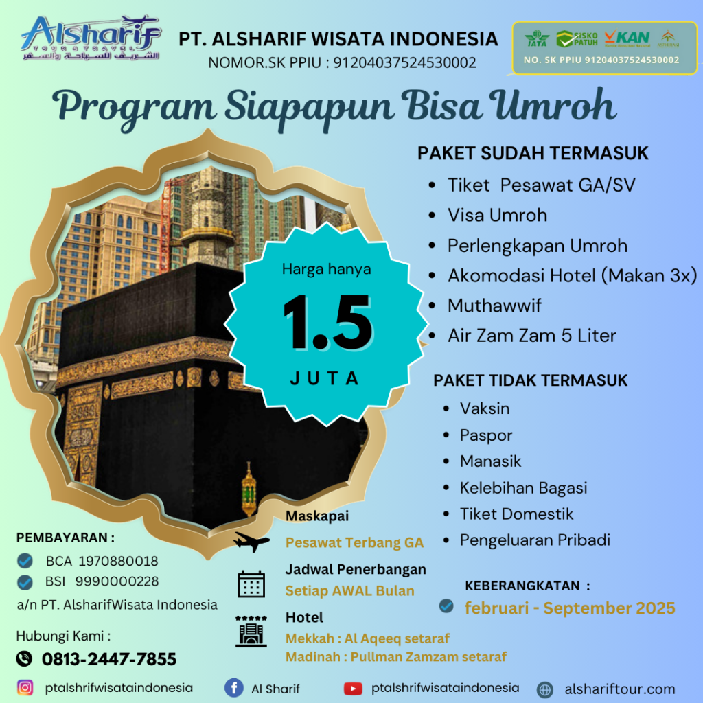 Kami percaya bahwa perjalanan ke Tanah Suci adalah impian setiap Muslim. Dengan Alsharif Tour & Travel, impian tersebut dapat terwujud dengan lebih mudah dan berkah. Baik sebagai jamaah maupun mitra, Anda memiliki peluang besar untuk mendapatkan manfaat dunia dan akhirat.